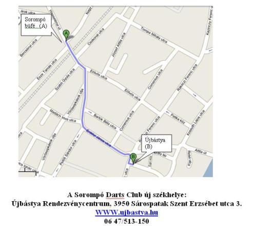 A Soromp Darts club a mai naptl kezdve j helyre kltztt. Az j hely neve s cme, jbstya Rendezvnycentrum Srospatak Szent Erzsbet utca 3. A darts club, a szoksos edzseit, s a rendezend versenyeit is itt fogja szervezni. A rendezvnycentrumban mkdik internetkvz brral, s az t msik oldaln pedig pizzria s tterem tallhat. Mindenkit szeretettel vrunk az j helynkn is.